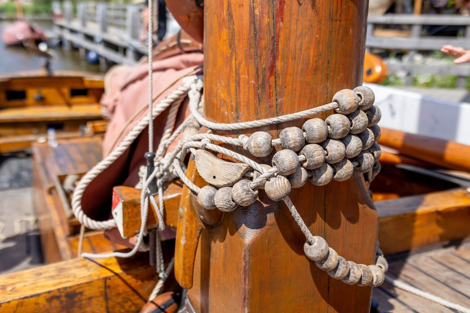 Op de bun ligt een deksel, zodat de vis er van bovenaf kon worden uitgeschept. Aan weerskanten hangen de zwaarden, die worden neergelaten om tegendruk te geven aan de zeilen en om afdrijven tegen te gaan.